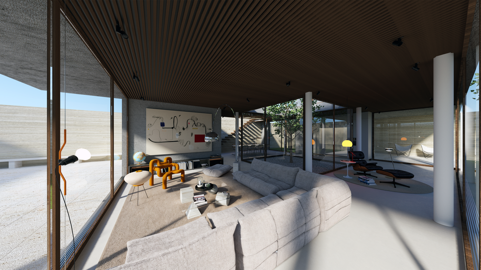 Der Entwurf dieses Hofhauses besticht durch die offene Gestaltung des Erdgeschosses, bei der eine harmonische Balance zwischen Freiraum und Innenbereich geschaffen wird. Im Zentrum des Erdgeschosses wurde ein Atrium integriert, das nicht nur als ästhetisches Element dient, sondern auch die Verschmelzung zwischen Architektur und Freiraum verdeutlicht. Gleichzeitig erfüllt das Atrium eine wichtige Funktion hinsichtlich der Belichtung des gesamten Raumes und sorgt für eine angenehme Lichtatmosphäre. Durch die offene Gestaltung der Räume gehen der Wohnraum, die Küche, die Leseecke, der Essbereich und der Wohnbereich fließend ineinander über. Diese durchdachte Raumaufteilung schafft ein Gefühl von Weite und Verbundenheit und ermöglicht eine flexible Nutzung der verschiedenen Bereiche. Die Räume wirken dadurch großzügig und lichtdurchflutet, ohne klare Trennungen, was die Atmosphäre offen und einladend macht.